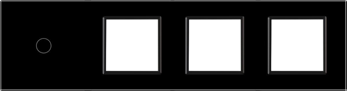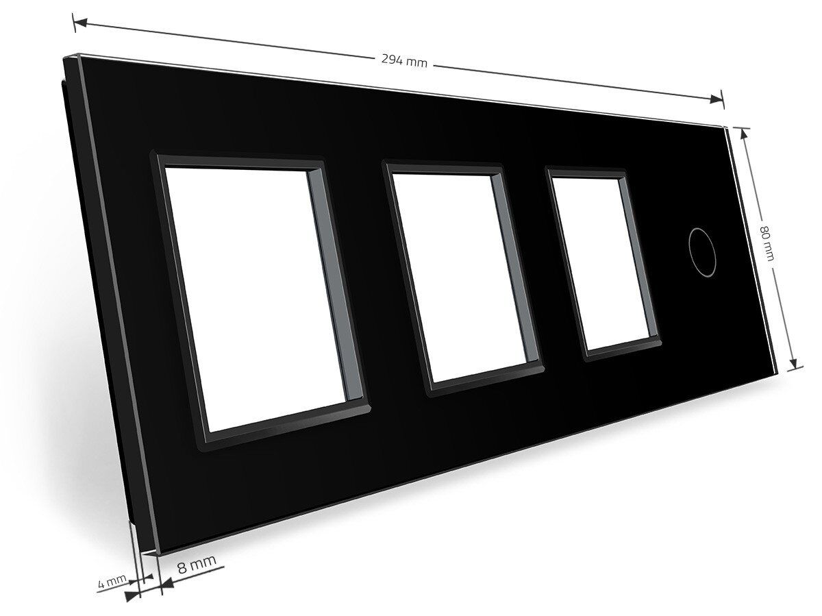• Скляна панель із загартованого скла призначена для сенсорних вимикачів та розеток Livolo. Даний варіант панелі підходить для монтажу 1-ого сенсорного вимикача для управління 1 зоною освітлення. Три відділення рамки підходить для монтажу 3х електричних розеток, 6-ух мультимедійних розеток.