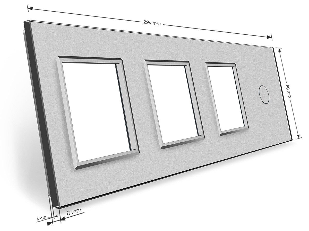 • Скляна панель із загартованого скла призначена для сенсорних вимикачів та розеток Livolo. Даний варіант панелі підходить для монтажу 1-ого сенсорного вимикача для управління 1 зоною освітлення. Три відділення рамки підходить для монтажу 3х електричних розеток, 6-ух мультимедійних розеток.