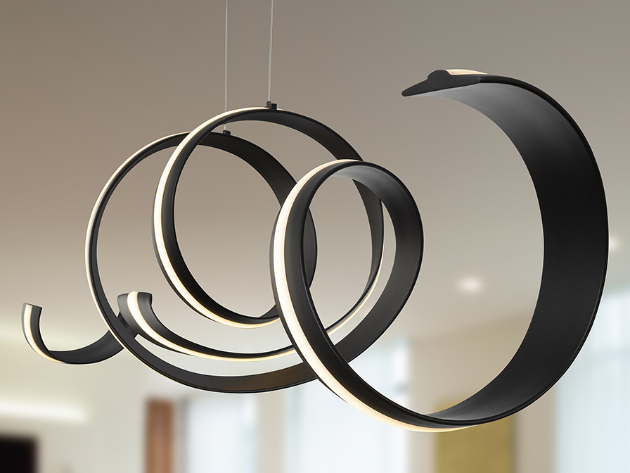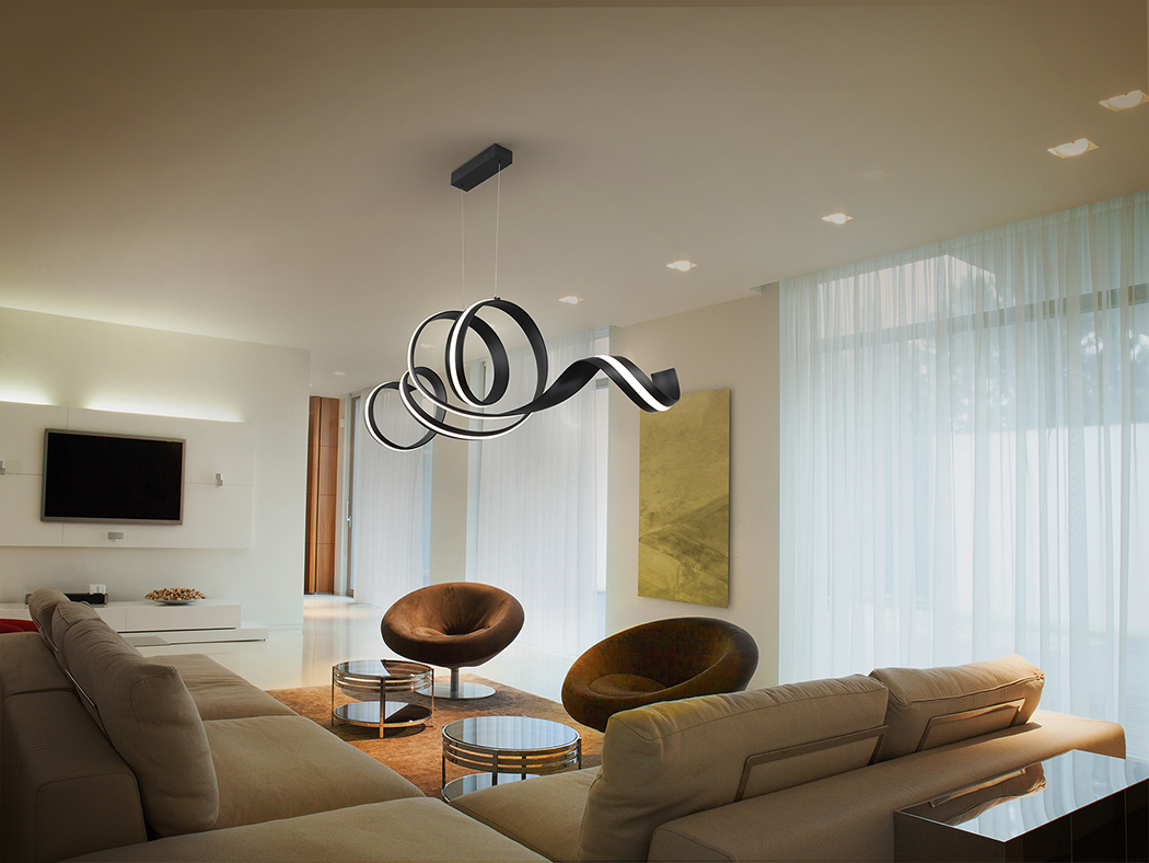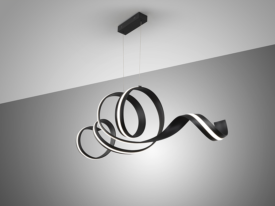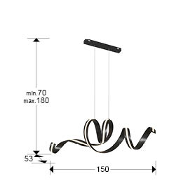 Великий горизонтальний світильник, виготовлений зі сталі та алюмінію, матове чорне покриття. Силіконовий розсіювач. Регульована висота. Світлодіодне освітлення потужністю 80 Вт, колірна температура: 2700-5000 K, 5200 лм. Регульована яскравість. Пульт дистанційного керування в комплекті.