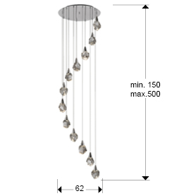 Світлодіодна лампа на 12 лампочок, виготовлена з хромованого металу. Багатогранні абажури з суцільного скла з декоративними бульбашками всередині. Регульована висота. Світлодіод потужністю 48 Вт. 5400 лм. 3000 К.