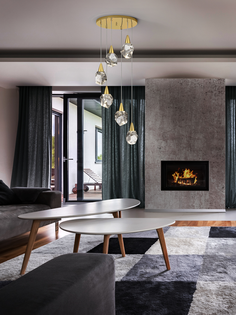 Світлодіодна лампа на шість лампочок виготовлена з матового металу з золотим покриттям. Багатогранні абажури з суцільного скла з декоративними бульбашками всередині. Регульована висота. Світлодіод 24 Вт. 2700 лм. 3000 К.