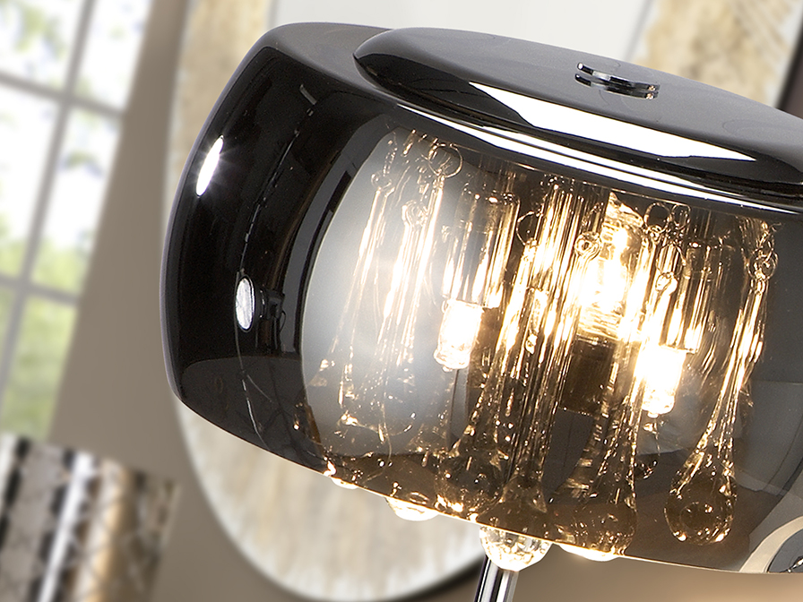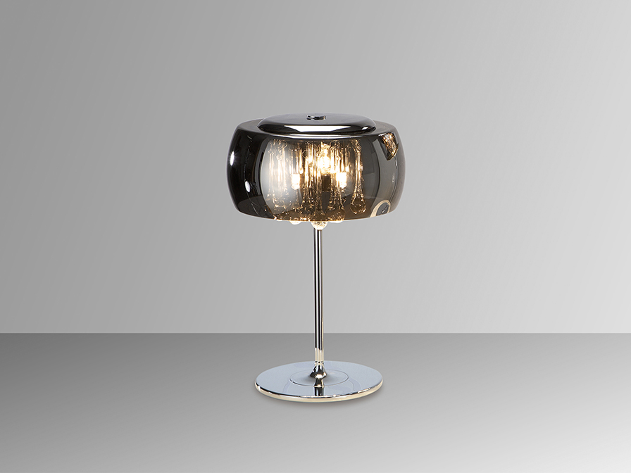 Настільна лампа з трьома лампами, виготовлена з хромованого металу. Абажур із дзеркального скла з внутрішньою частиною у стилі муранського скла.