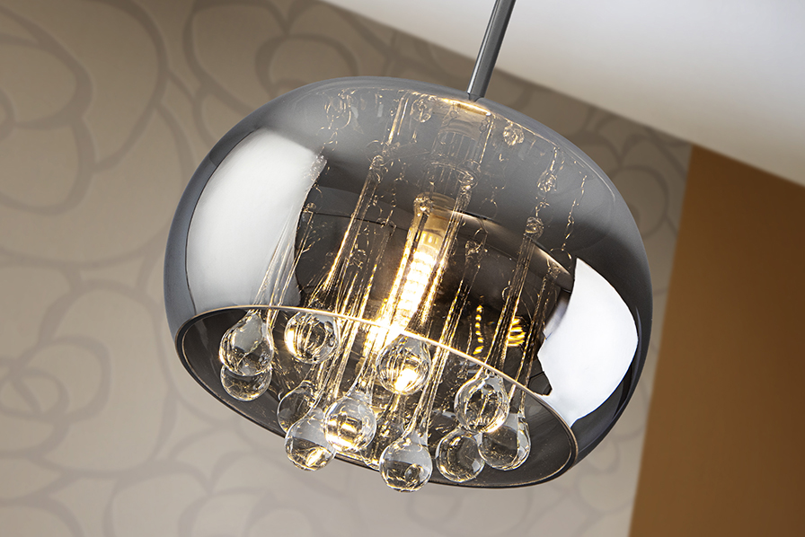 Однолампова люстра з хромованого металу. Абажур із дзеркального скла та внутрішні підвісні світильники з муранського скла.