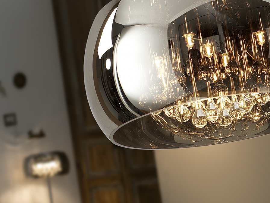 П'ятилампова люстра з хромованого металу. Дзеркальний скляний абажур та внутрішні підвісні світильники з муранського скла.