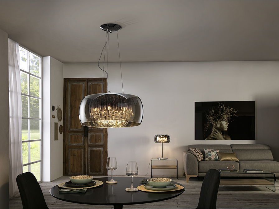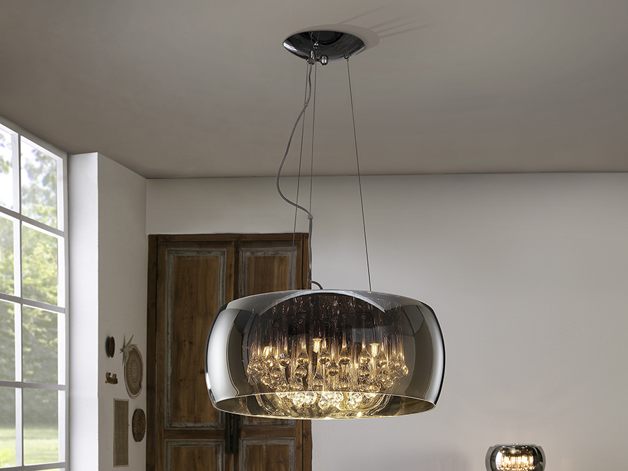 Підвісна лампа виготовлена з хромованого металу. Абажур із дзеркального скла та краплі в муранському стилі всередині. Регульована яскравість. Пульт дистанційного керування в комплекті.
