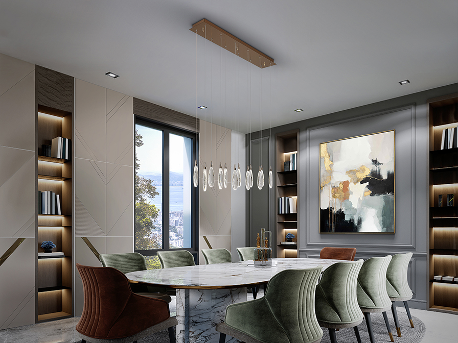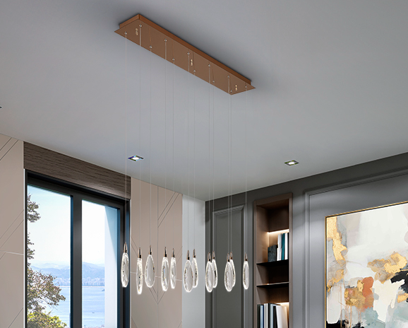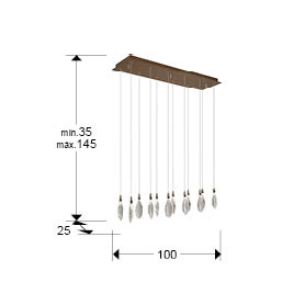Прямокутна лампа зі сталі та металу, покриття рожевого золота. 12 лампочок з крапельками огранованого кришталю та краплями з розтріскуванням. Регульована висота. Світлодіодне освітлення 24 Вт, колірна температура: 2700-6000 K, 2400 лм, з РЕГУЛЯТОРОМ ЯСКРАВОСТІ. Пульт дистанційного керування в комплекті.