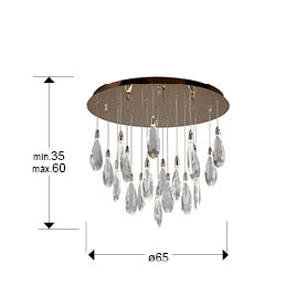 Люстра зі сталі та металу з покриттям кольору рожевого золота. 19 лампочок з огранованими кришталевими крапельками та краєвидами з розтріскуванням. Регульована висота. Світлодіодне освітлення потужністю 38 Вт, колірна температура: 2700-6000 K, 3800 лм, з регульованою яскравістю. Пульт дистанційного керування в комплекті.