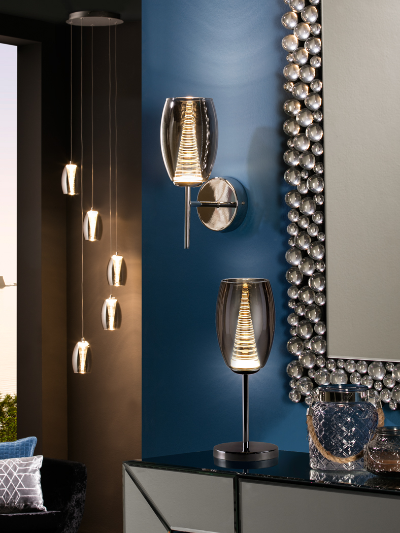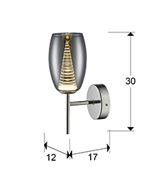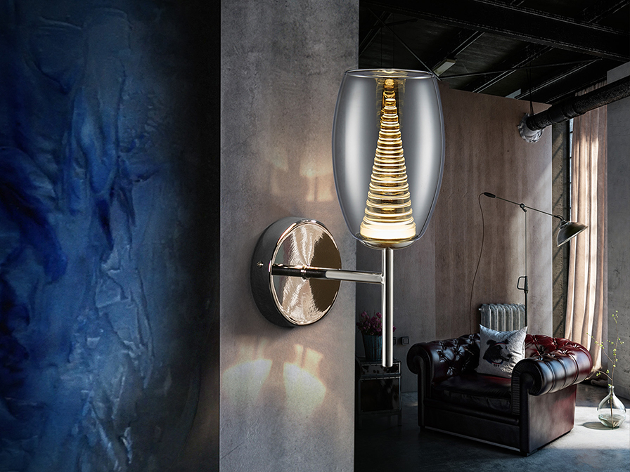 Настінний світлодіодний світильник з однією лампочкою, виготовлений з хромованого металу. Подвійний абажур, дзеркальне скло зовні та прозорий полікарбонат зсередини, у формі ступінчастого конуса. Світлодіод 5 Вт. 450 лм, 3000 К.