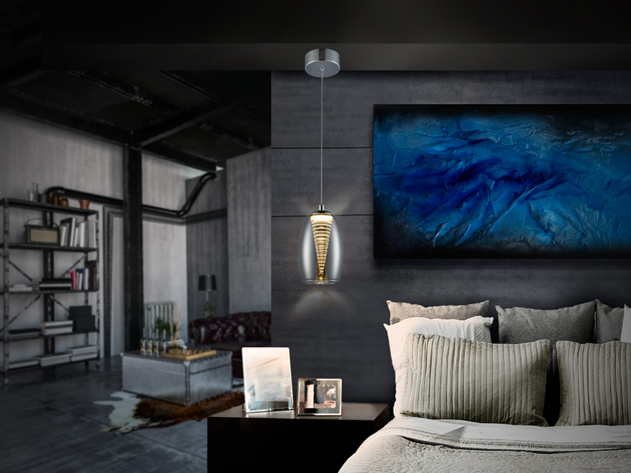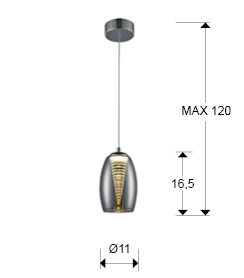 Світлодіодна лампа з однією лампочкою, виготовлена з хромованого металу. Подвійний абажур, дзеркальне скло зовні та прозорий полікарбонат зсередини, у формі ступінчастого конуса. Регульована висота. Світлодіод 5 Вт. 450 лм, 3000 К.