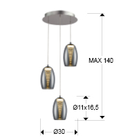 Світлодіодна лампа на 3 лампи, виготовлена з хромованого металу. Подвійний абажур, дзеркальне скло зовні та прозорий полікарбонат зсередини, у формі ступінчастого конуса. Регульована висота. 3 світлодіоди по 5 Вт. 1350 лм, 3000 К.