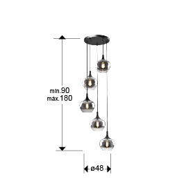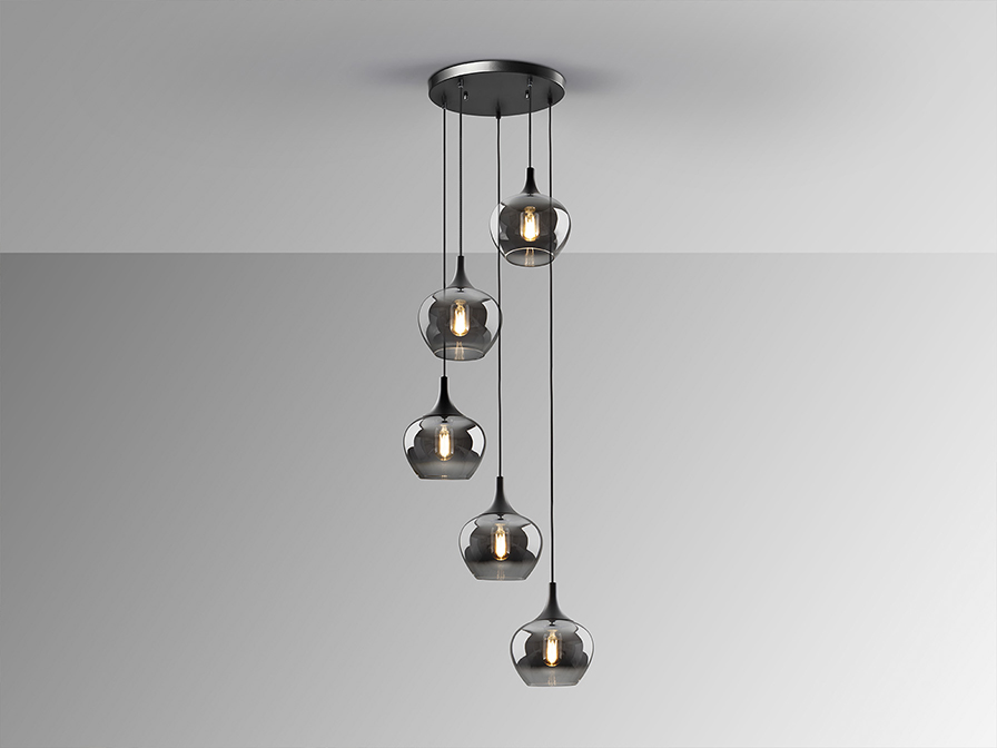 Лампа на 5 лампочок, виготовлена з матового чорного металу. Абажур діаметром 19 см з литого димчастого градієнтного скла. Регульована висота.