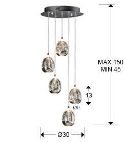 Світлодіодна лампа на 5 лампочок. Виготовлена з хромованого металу. Абажури у формі краплі з суцільного скла з декоративними бульбашками всередині. Регульована висота. Світлодіод 25 Вт. 2400 лм. 3000 К.