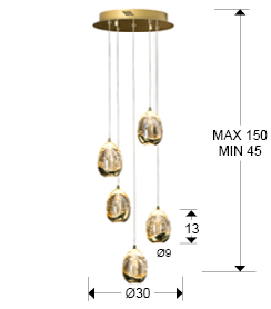 Світлодіодна лампа на 5 лампочок. Виготовлена з металу із золотистим покриттям. Абажури у формі краплі з суцільного скла кольору шампанського з декоративними бульбашками всередині. Регульована висота. Світлодіод 25 Вт. 2400 лм. 3000 К. Регульована яскравість.
