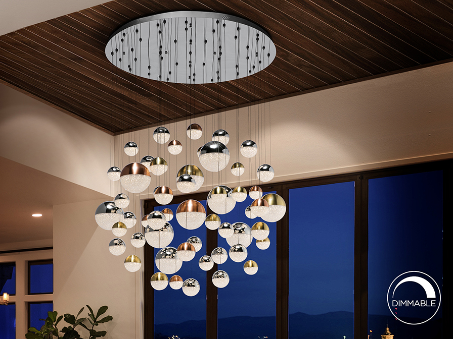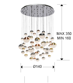 Лампа ВЕЛИКОГО РОЗМІРУ, хромована. 55 світлодіодів. Сферичні плафони з полікарбонату 10, 12 і 20 см з текстурою всередині та металевим покриттям із сатинованої міді, сатинованої латуні та хрому. Регульована довжина. Світлодіод потужністю 288 Вт. 3 000 тис. 18,720 лм. РЕГУЛЮВАННЯ ЗАТЕМНЕННЯ. Дистанційне співробітництво. Цей продукт містить світлодіодні драйвери з регулюванням 0-10 В або ШІМ, приймач і пульт дистанційного керування за допомогою радіочастот. Щоб використовувати його з настінним диммером, використовуйте саме цей тип диммерів. Будь-який інший тип може пошкодити світлодіодний драйвер.